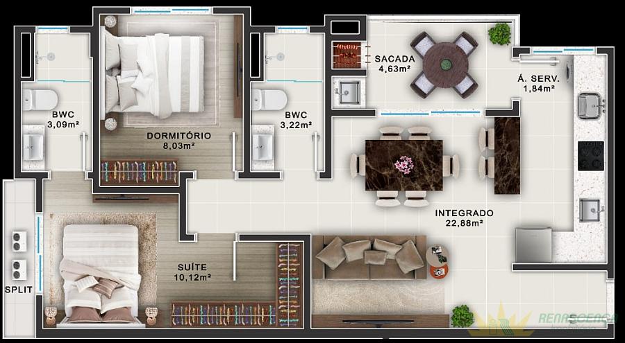2 dormitórios (1 suíte)